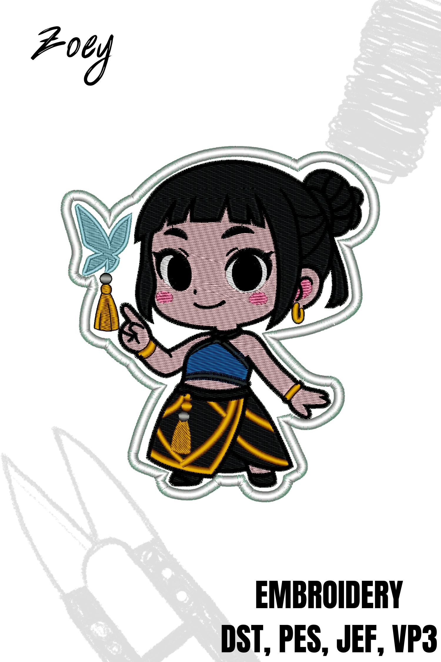 Zoey Huntrix character from KPOP Demon Hunters movie digital embroidery machine file.